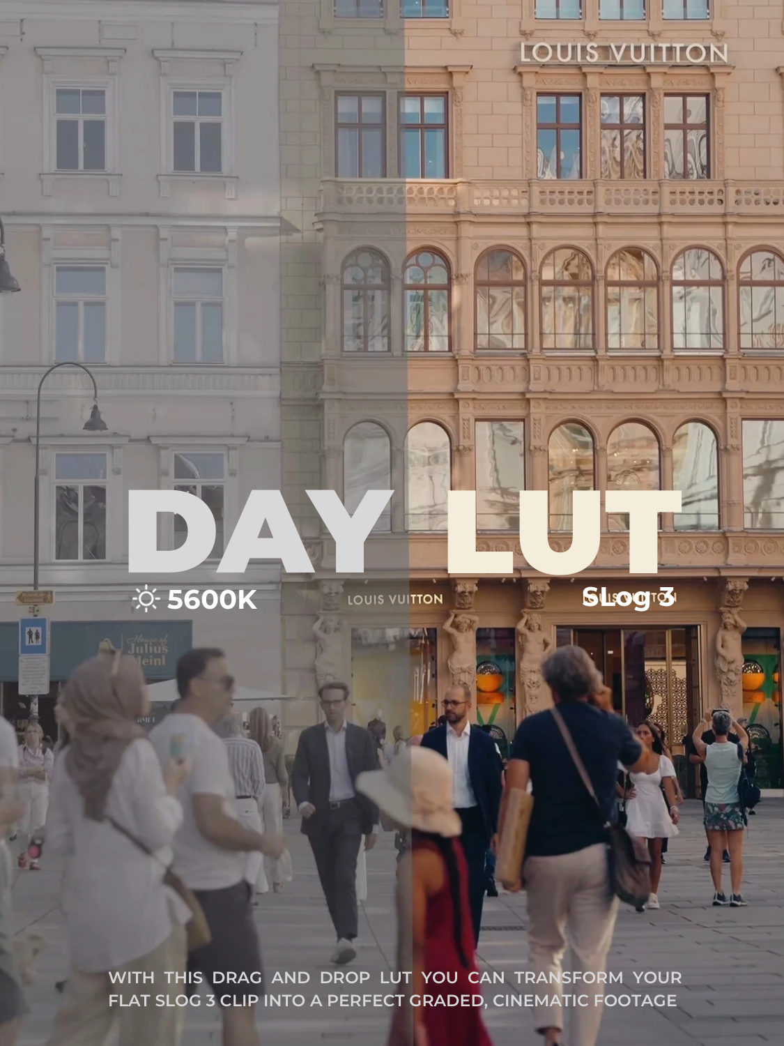 With this drag and drop LUT you can transform your flat looking SLog3 clips into graded and cinematic footage. Make sure to set your WB to 5600K during a sunny day and overexpose by 1-1.7 stops. This LUT works with any platform like DaVinci Resolve, VN, CapCut and PremierePro.